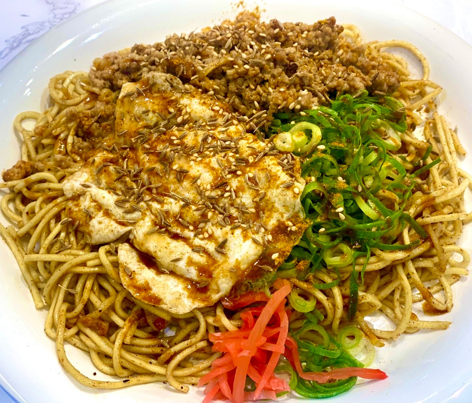 キーマカレーベースで味付けした焼きそばを坦々麺風に仕上げました。