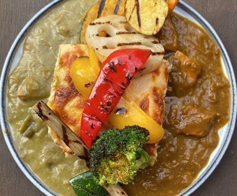 人気のミートラザニアにローストした夏野菜と、チキンカレー&グリーンカレーソースをダブルで合い盛りにしました。2種のスパイスをお楽しみいただけます。