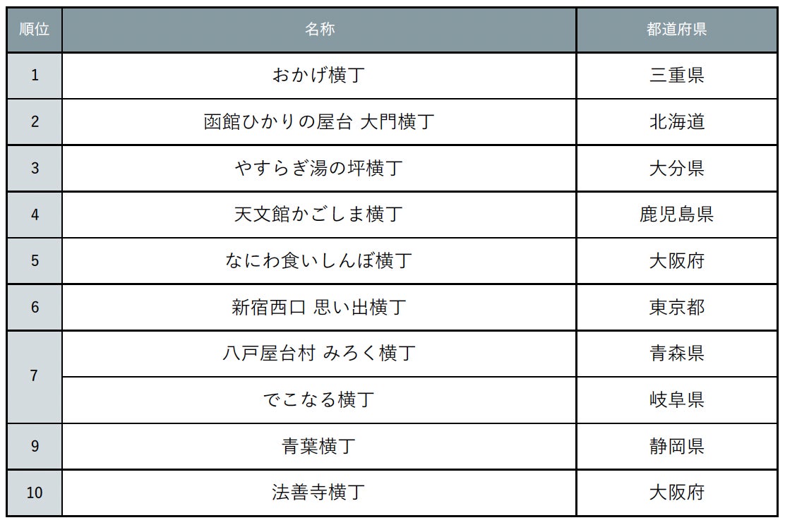 そのほかトップ10には、食べ歩きが楽しめる横丁から、はしご酒を満喫したくなるところまでさまざまな横丁がランクインする結果となりました。その土地ならではの郷土料理が味わえるだけでなく、ノスタルジックな雰囲気に没入できるのも注目ポイントです。ランキング結果を参考に、旅先で横丁にくり出してみてはいかがでしょうか。新たな魅力が発見できるかもしれません。