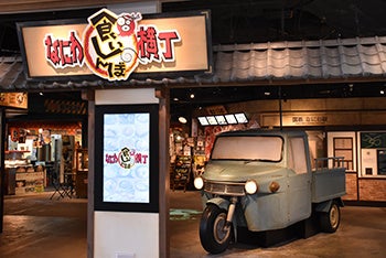 大阪万博(1970年)を目前にした“大阪がもっとも元気に光り輝いていた時代”をテーマに大阪の街並みを再現した横丁です。牛ホルモンをカリカリに揚げた油かすがのったかすうどん、お好み焼き、イカ焼きといった関西を代表する“なにわグルメ”をメインに約15軒が集まるフードテーマパークです。