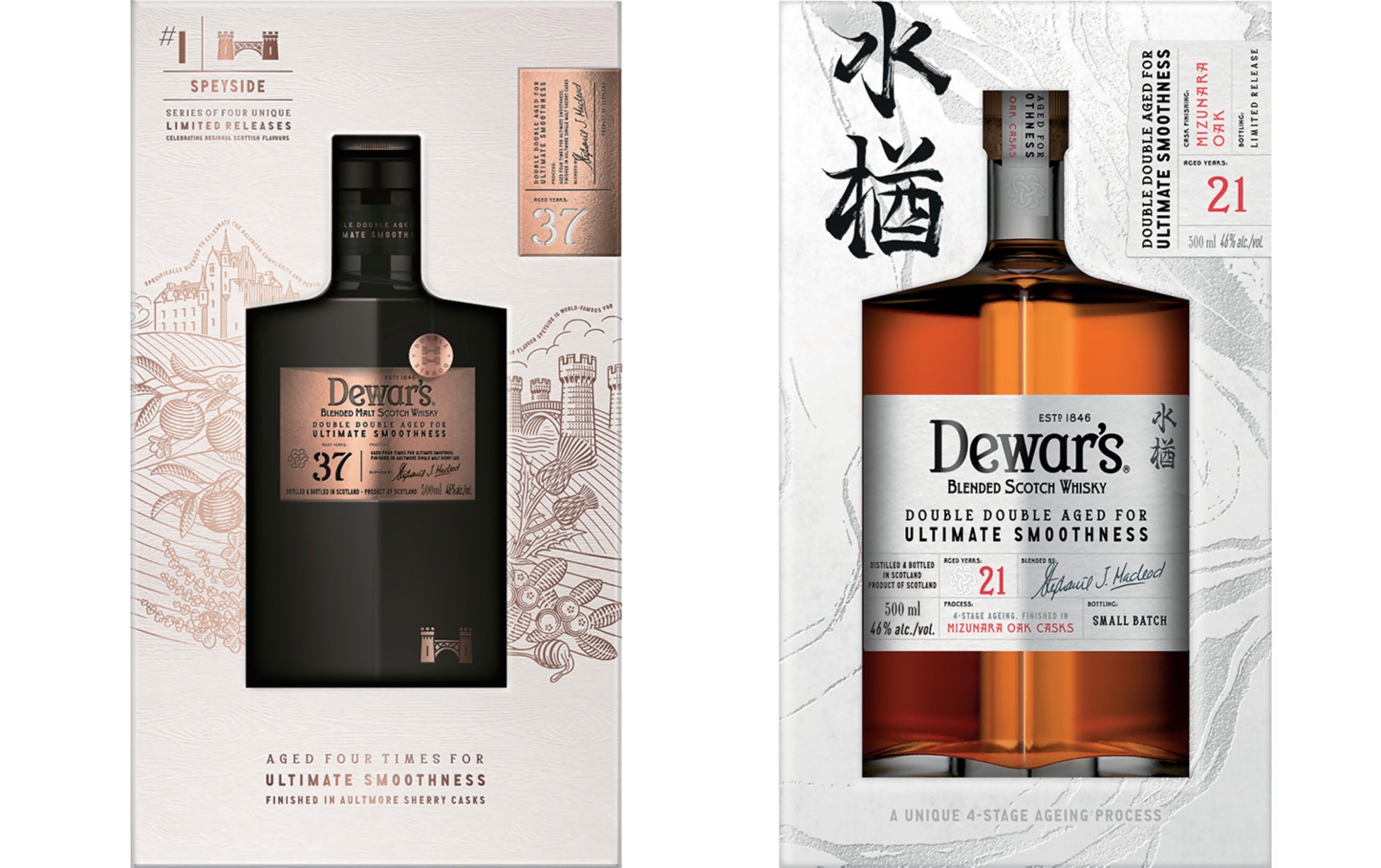 「デュワーズ ダブルダブル37年」「デュワーズ ダブルダブル21年ミズナラ」2品をそれぞれ180本数量限定発売