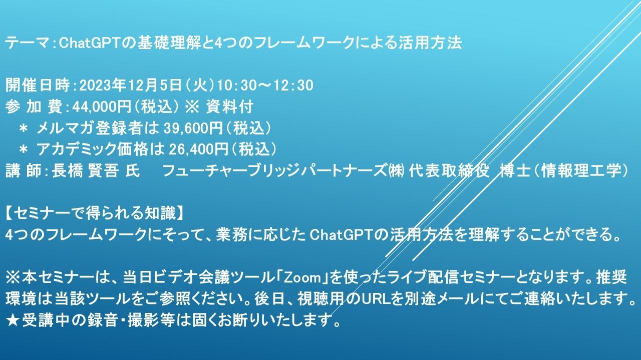 【ライブ配信セミナー】ChatGPTの基礎理解と4つのフレームワークによる活用方法 12月5日(火)開催 主催:(株)シーエムシー・リサーチ