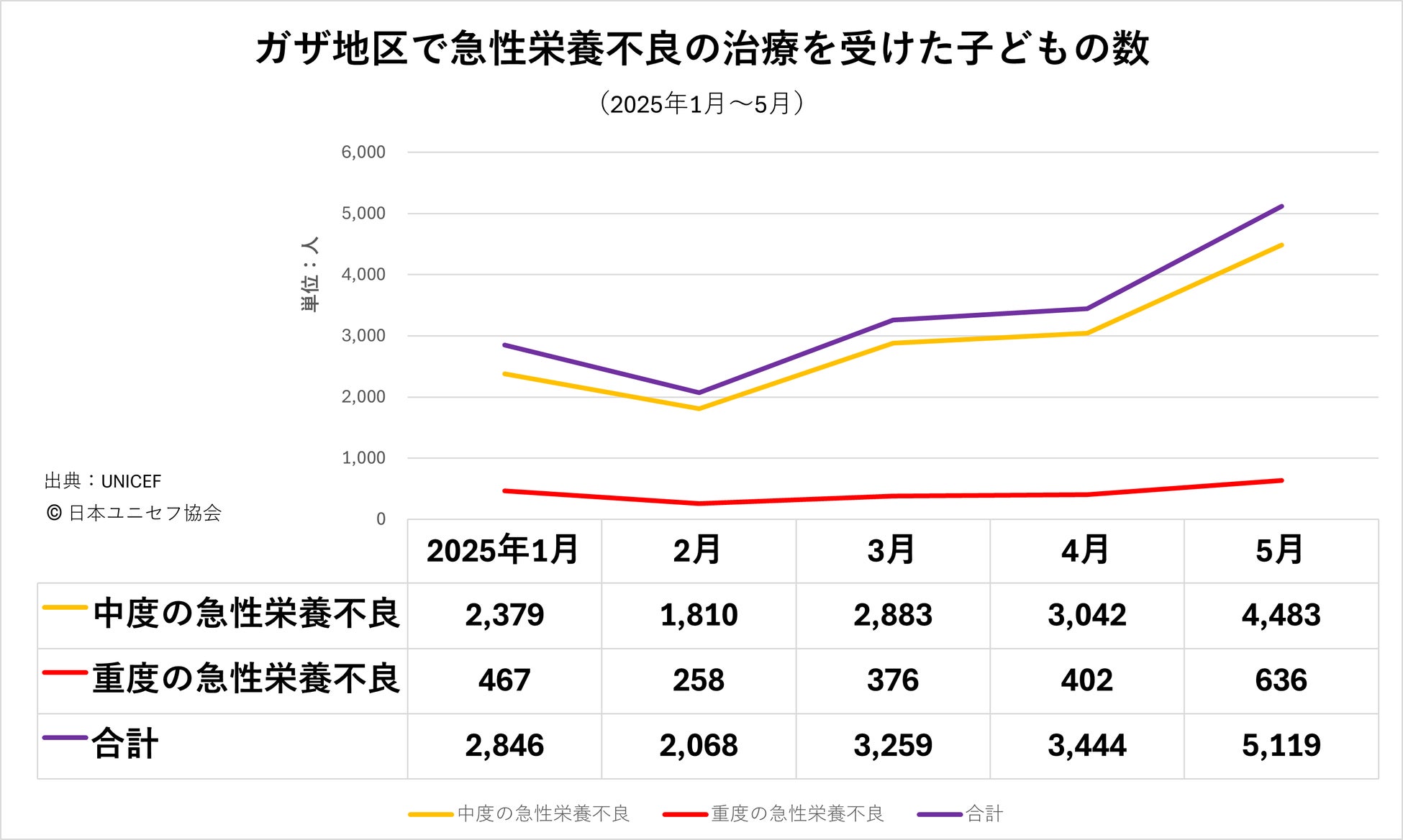 ガザ地区では栄養不良の子どもが驚くべき速度で増えており、5月だけでも生後6カ月から5歳までの5,119人の子どもが急性栄養不良の治療を受けた、とユニセフ(国連児童基金)は警鐘を鳴らしています。