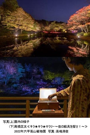 赤・黄・橙など様々に色づいた木々をライトアップし、昼間とは違う幻想的な夜の植物園をお楽しみいただけます。紅葉の魅力をお伝えする紅葉ガイドも実施しています。また、園内に展示されている六甲ミーツ・アート 芸術散歩2022出展作品のライトアップや、光を使ったアートを手掛ける高(※1)橋匡太による体験型の新作「キラ★キラ★キラリー~夜の絵具を探せ~」の展示を行っています。