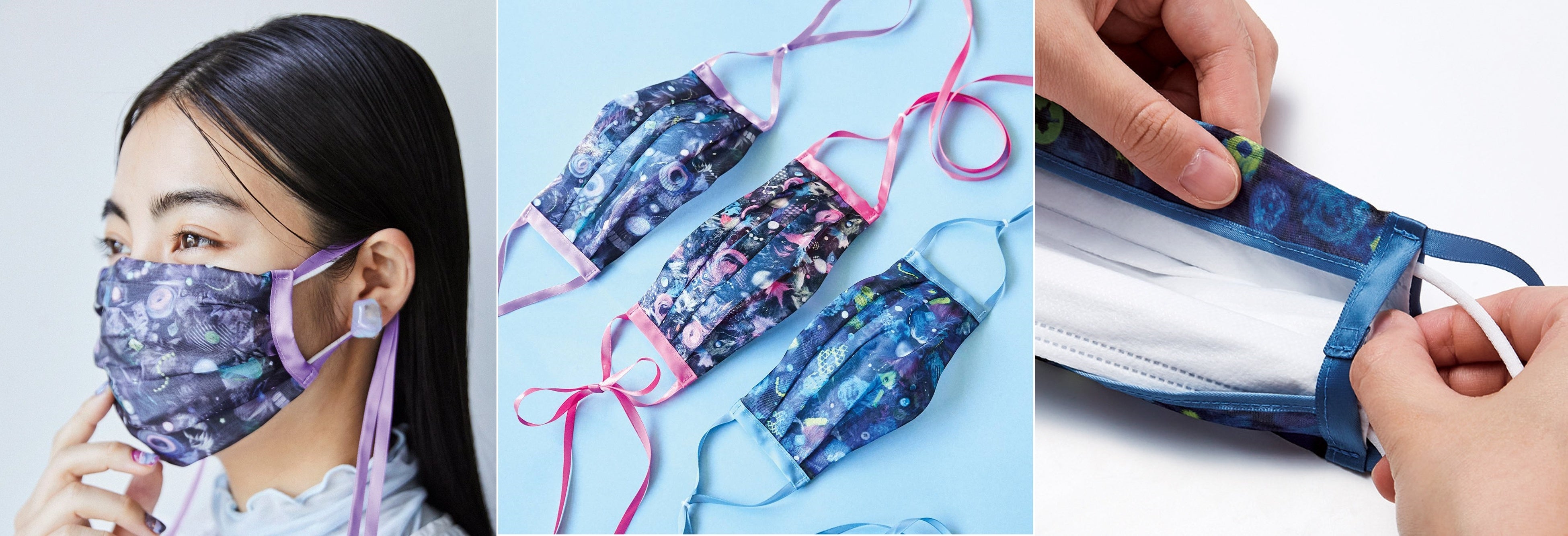 シンプルで味気ない不織布マスクに華やかなマスクカバーをプラス。重ねても息苦しくなりにくいオーガンジー素材で、着けると肌なじみよくメイクしたみたいにパッと明るくなってマスク映え。リボンは垂らしたままでも結んでもOK! アクセサリー感覚で使えるマスクカバーは、お出かけ中のオンとオフでさっと着け外しできるのも◎。透け感のある素材にプリントしています。キラッとシャイニー&濃色ベースのカラーはつや感+色白見えも期待できそう。不織布マスクをマスクカバーにセットし、両サイドからマスクのゴムひもを出してセットして使用します。