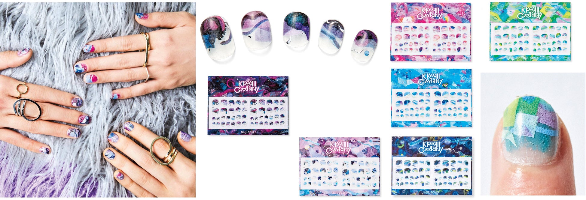 増田セバスチャンさんのアトリエで生まれた作品と、作品から抽出したカラーのブラッシュをミックス。塗りかけネイルみたいなデザインのジェル風ネイルシールに仕上げました。素のつめに貼ったり、はげかけたネイルのリペアにも◎。オーロラ箔とシルバー箔のキラキラもきいてます。