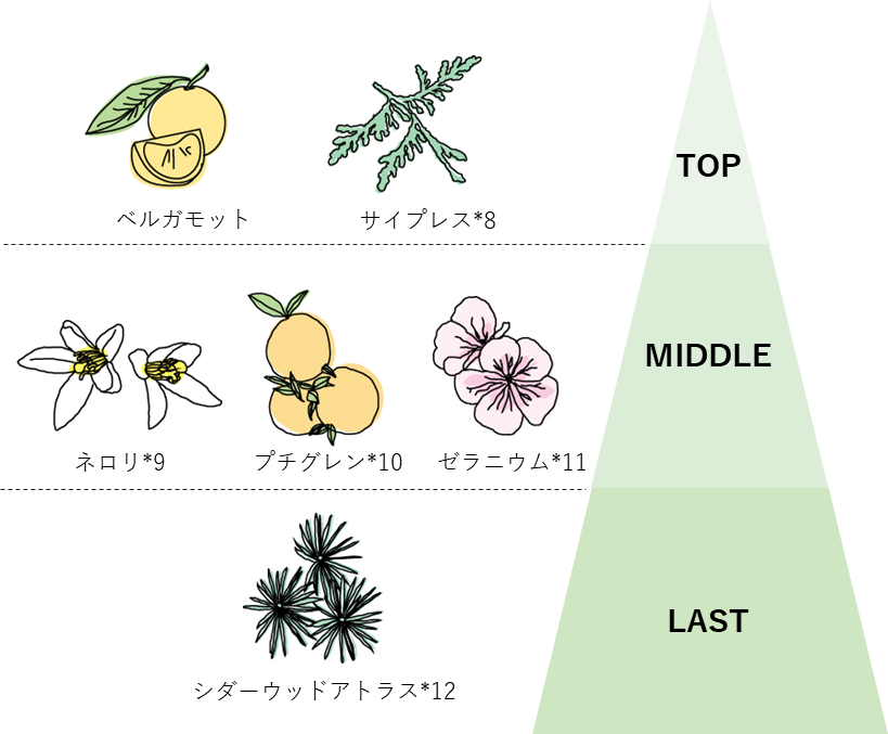 ビターで上品なネロリと清潔感のあるサイプレスに時折のぞく芳醇な甘さが心を満たしてくれます。