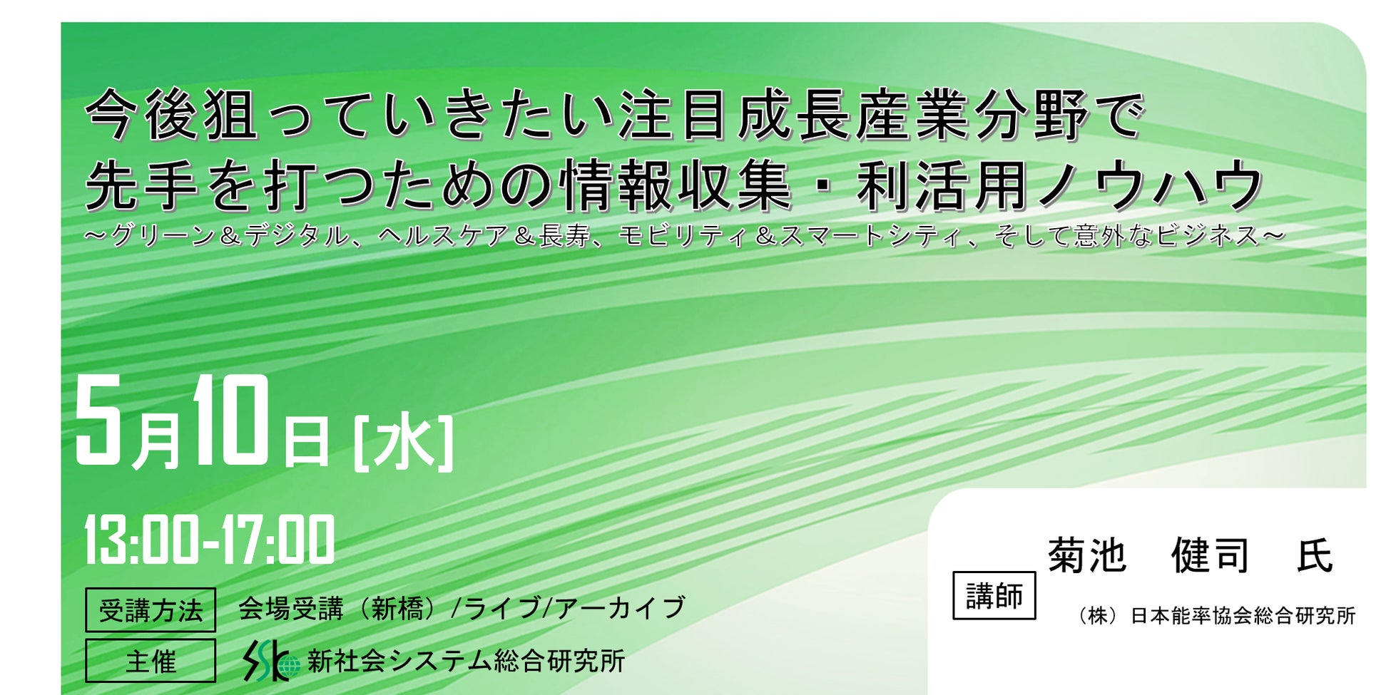 本セミナーでは、長年に渡り、数多くの企業や公的機関において、情報収集・利活用ノウハウを基軸に多くの企業や公的機関の「未来探索活動」を支援している講師が、新ビジネスを意識した情報収集活用ノウハウや、新春らしく今後注目すべき重要なビジネストレンド解説、そして未来を見据える視点の置き方について詳しく解説いたします。特に、成長産業の3強である「グリーン&デジタル」「ヘルスケア&長寿」「モビリティ&スマートシティ」といった分野に関する解説はもちろんのこと、意外な成長ビジネスを読み解く視点を解説いたします(詳しくは当日)。ICT関連のお客様はもちろんですが、新規事業責任者/担当者、そして未来探索等に携わる経営者、マネジャー、戦略立案担当者、R&D部門担当者様においては、必ずやお役に立つ内容となっております。