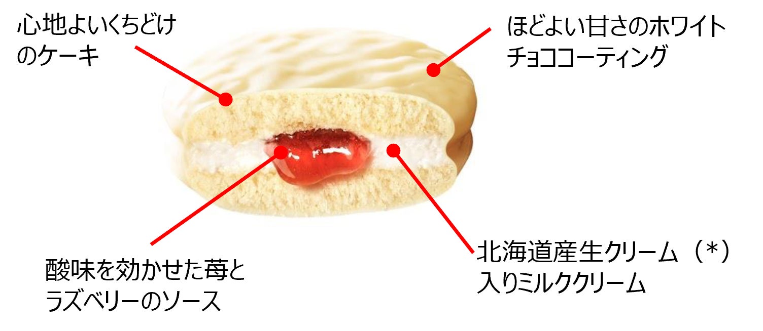 北海道産生クリーム(*)入りのミルククリームやホワイトチョコレート、酸味を効かせた苺とラズベリーのダブルベリーソースが一体となって、ケーキを味わうようなご褒美気分になれるチョコパイです。