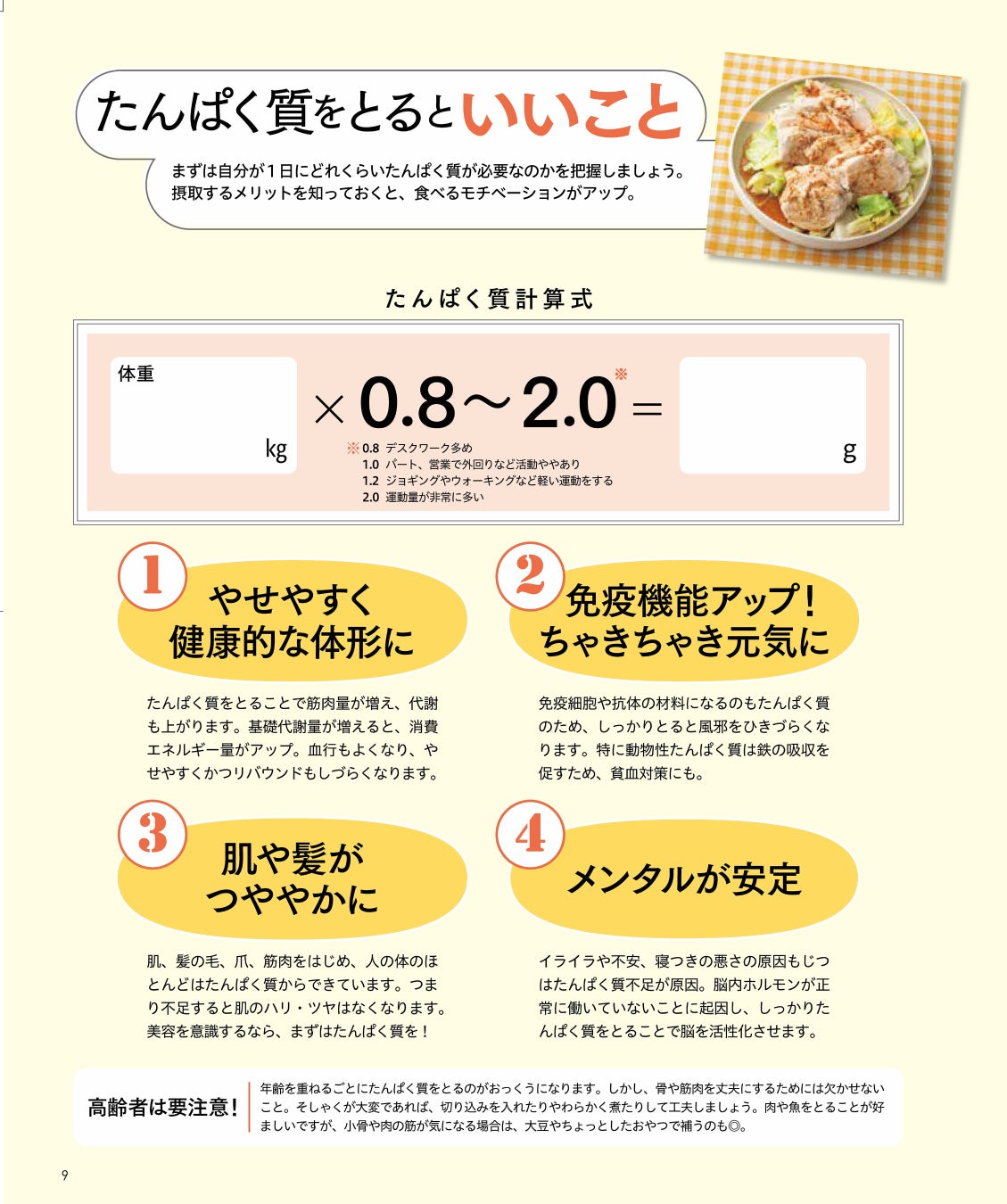 本書では冒頭に、日々の運動量から1日に必要なたんぱく質量を算出できる計算式を掲載しています。