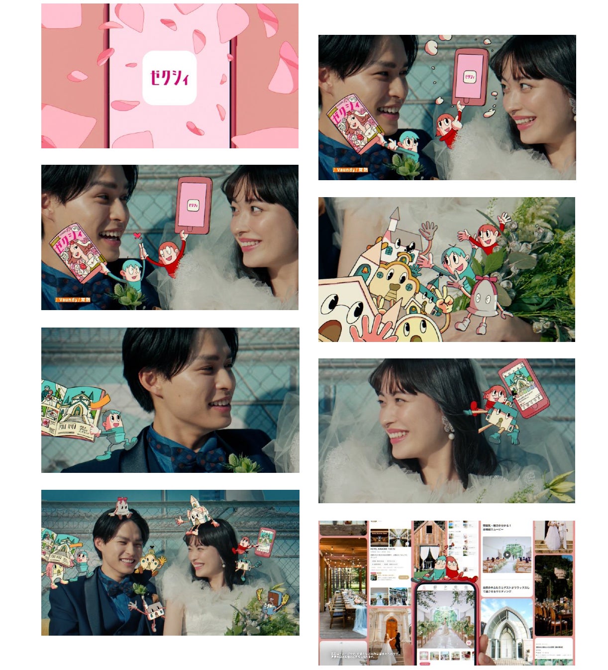 今回のCMでは、茅島さん、兵頭さん演じる新郎新婦がソファで楽しそうに話す様子をバックに、アニメキャラクターになったおふたりが画面狭しと『ゼクシィ』アプリを紹介します。キャラクターになった兵頭さんが『ゼクシィ』誌面で結婚式場を探し、気に入った式場に「いいね!」と付箋を貼ると、こちらもキャラクターになった茅島さんがアプリを使って「いいね! からのすぐ予約」と応酬。同じ会場を選んでいたことに気付いたふたりは、「おそろ~」と口をそろえて喜びます。オリジナルのアニメーションとおふたりの仲むつまじくほほ笑み合う様子が交差する、ポップでキュートなCMが完成しました。