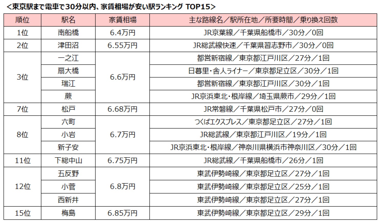 東京駅まで電車で30分以内、家賃相場が安い駅ランキング2024 1位・2位は千葉県内の駅がランクイン!