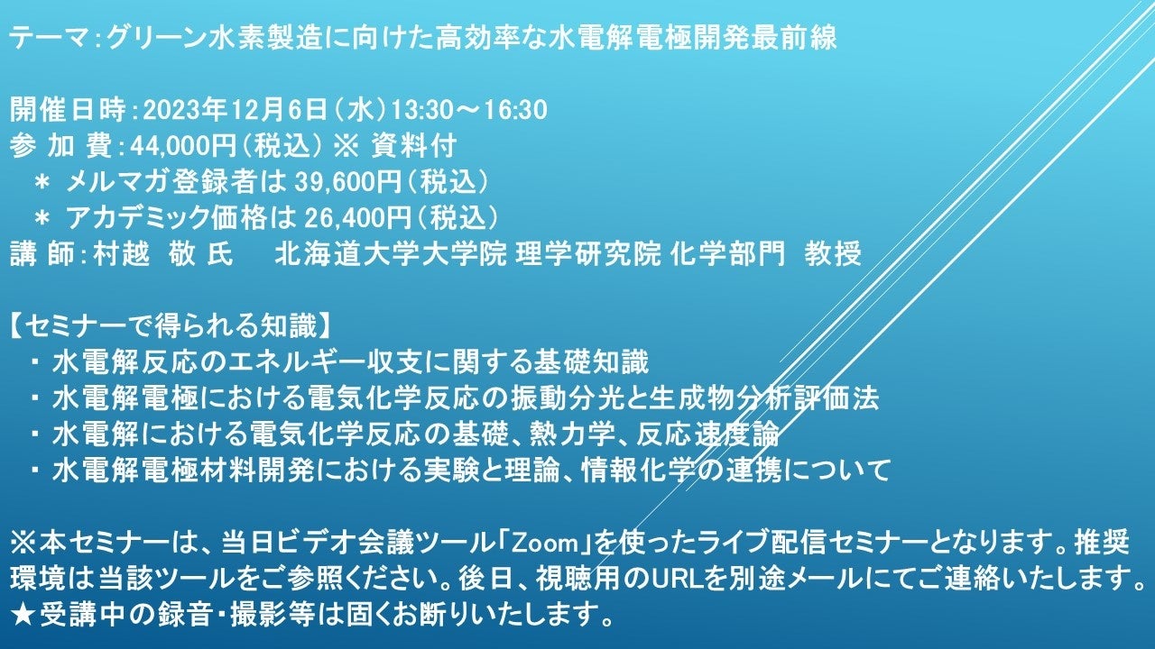 【ライブ配信セミナー】グリーン水素製造に向けた高効率な水電解電極開発最前線 12月6日(水)開催 主催:(株)シーエムシー・リサーチ