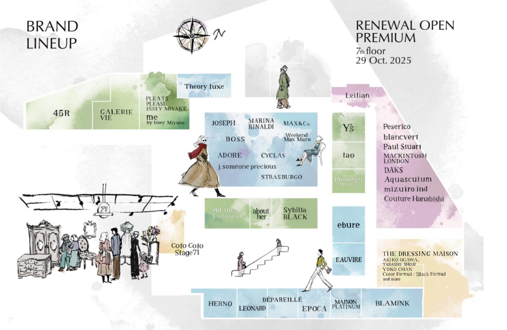 BLAMINK(ブラミンク)、ADORE(アドーア)、CYCLAS(シクラス)、〇STRASBURGO(ストラスブルゴ)、〇JOSEPH(ジョゼフ)、Theory luxe(セオリーリュクス)、j. someone precious(ジェイドット サムワンプレシャス)、〇HERNO(ヘルノ)、〇Weekend Max Mara&MAX&Co.(ウィークエンド マックスマーラ&マックス アンド コー)、〇BOSS(ボス)、〇MARINA RINALDI(マリナ リナルディ)、Y's(ワイズ)、tao(タオ)、●45R(フォーティファイブ・アール)、●GALERIE VIE(ギャルリー・ヴィー)、〇Sybilla BLACK(シビラ ブラック)、〇LEONARD(レオナール)、EPOCA(エポカ)、THE DRESSING MAISON(ドレスアップ&カラー・ブラックフォーマル、AKIKO OGAWA(アキコオガワ)、YOKO CHAN(ヨーコ チャン)他)、その他