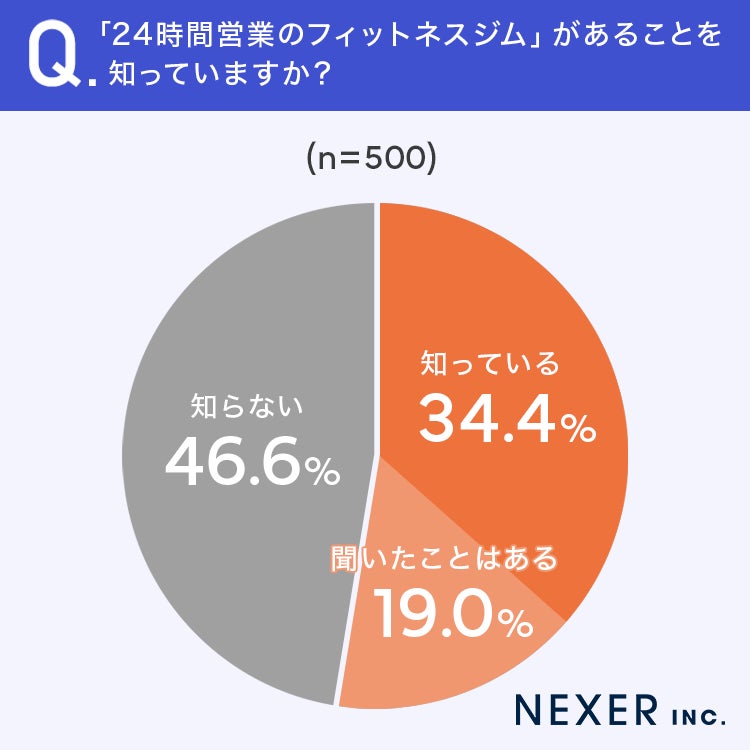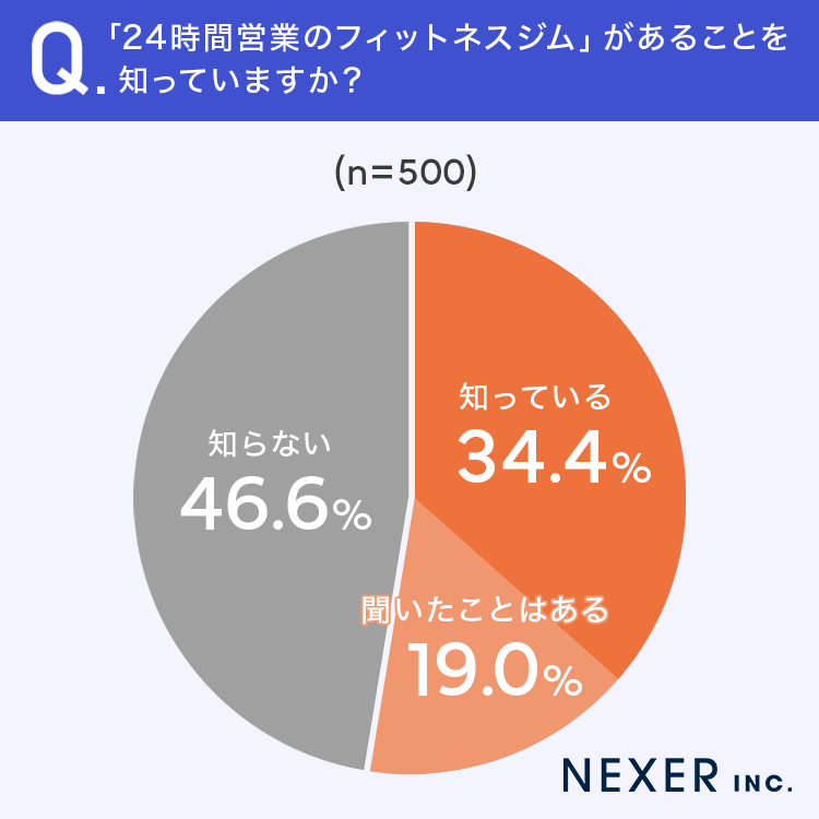 その結果「知っている」が34.4%、「聞いたことはある」が19.0%で、合わせると53.4%の方が24時間ジムの存在を認識しているという結果になりました。一方で「知らない」と回答した方は46.6%にのぼります。