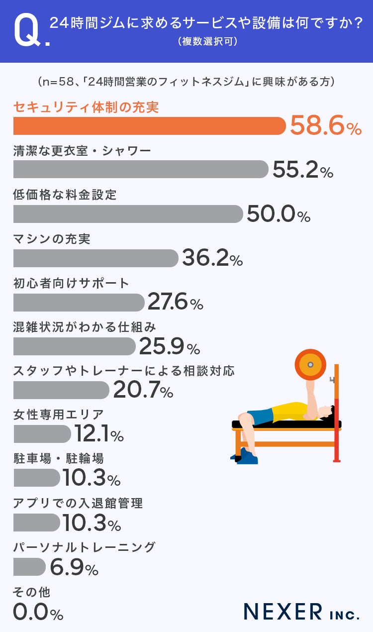 次いで「清潔な更衣室・シャワー」が55.2%、「低価格な料金設定」が50.0%でした。