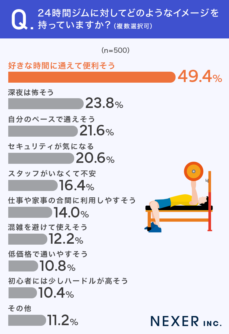 24時間ジムのイメージ「好きな時間に通えて便利」が約49%でトップ!興味がある人が求めるサービスと設備とは?