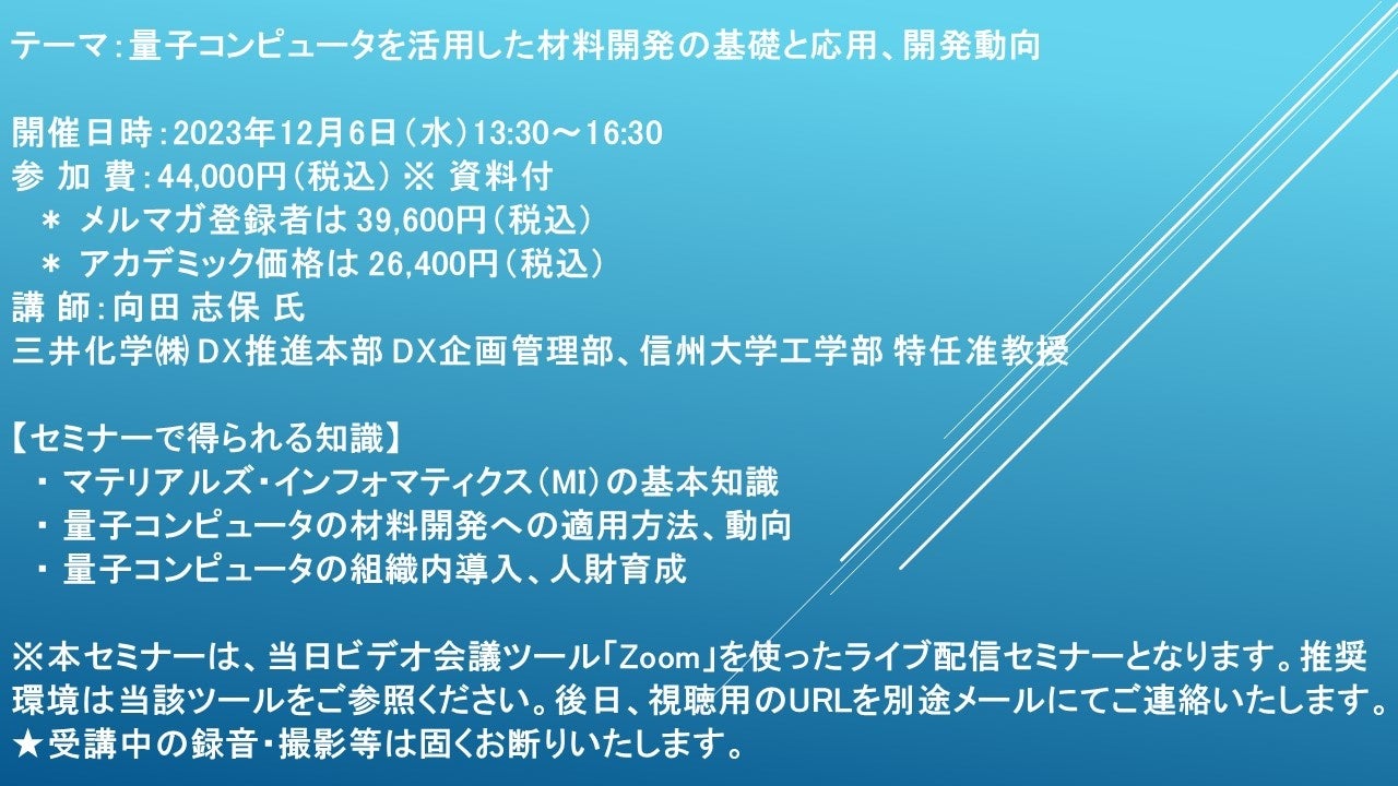 【ライブ配信セミナー】量子コンピュータを活用した材料開発の基礎と応用、開発動向 12月6日(水)開催 主催:(株)シーエムシー・リサーチ