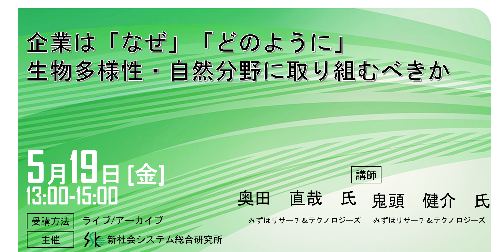 「どのように生物多様性に取り組むか」と題して、みずほリサーチ&テクノロジーズ 奥田 直哉氏、鬼頭 健介氏によるセミナーを2023年5月19日(金)に開催!!