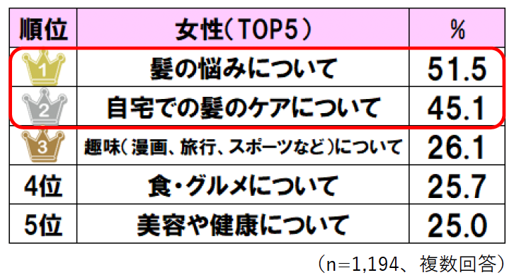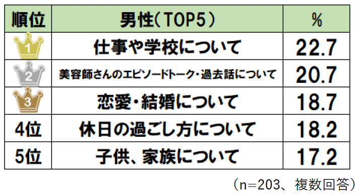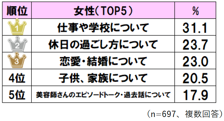 美容師との会話で楽しかった/役に立った話題では、「髪の悩み」「自宅での髪のケア」が男女とも上位にランクイン。「髪の癖を抑える方法」「自分に合った普段の髪の乾かし方」(自由回答より)など髪のプロならではの情報提供を求めている人が多いことが分かります。