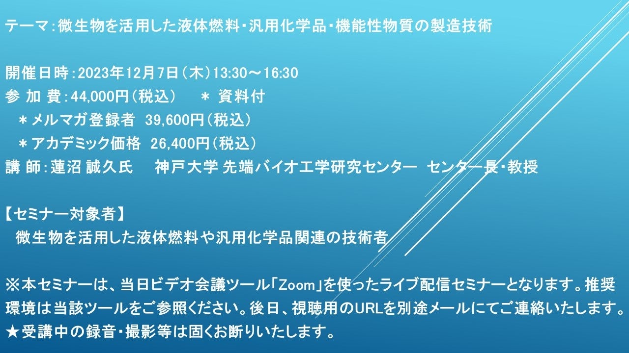 【ライブ配信セミナー】微生物を活用した液体燃料・汎用化学品・機能性物質の製造技術 12月7日(木)開催 主催:(株)シーエムシー・リサーチ