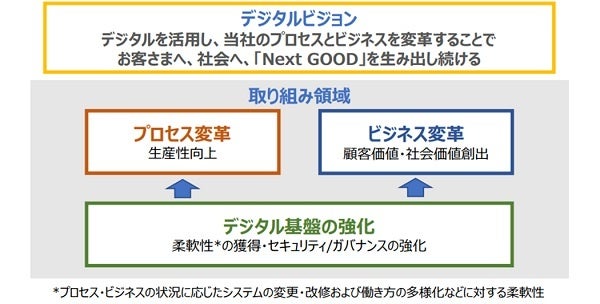 当社は、ミッションとして掲げる『「Next GOOD」お客さまへ。社会へ。一歩先の発想で、一歩先の価値を。』の実現に向け、さまざまな取り組みを推進しています。その一環として、2023年にデジタルビジョン「デジタルを活用し、当社のプロセスとビジネスを変革することで、お客さまへ、社会へ、『Next GOOD』を生み出し続ける」を定め、その実現に向け、3つの取り組み領域を設定し、デジタル化を推進しています。