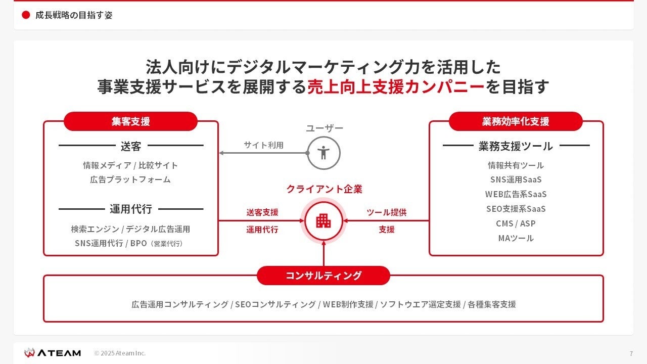 当社は、2024年9月6日に開示した「エイチーム 中期経営計画(FY2025-FY2028)」に記載のとおり、WEBマーケティングコンサルティング・WEB広告代理店等の法人向けマーケティング支援領域を新たな戦略の核に据え、事業シナジーを創出できるサービスをM&Aにより取り込み、マーケティングプロセスを垂直統合していくことで売上向上支援カンパニー化を図る方針です。2026年7月期以降のさらなる業績成長に向け、現在はデジタルマーケティングサービスの拡充に取り組んでおります。