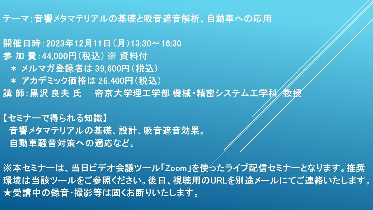 【ライブ配信セミナー】音響メタマテリアルの基礎と吸音遮音解析、自動車への応用 12月11日(月)開催 主催:(株)シーエムシー・リサーチ