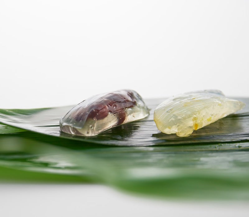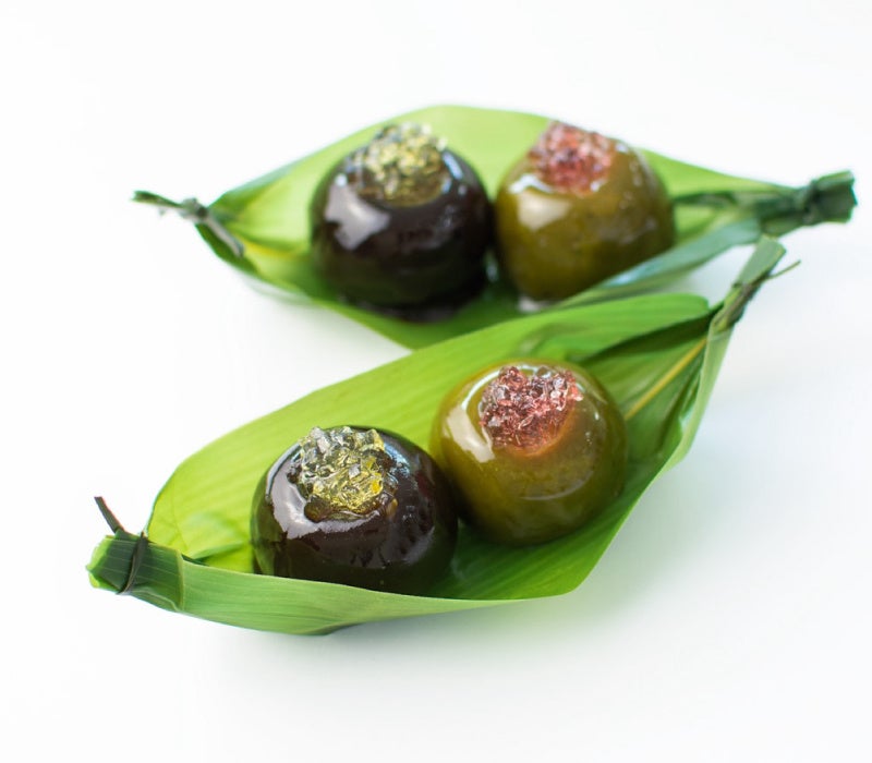 こしあんに黒糖羊羹をかけた老玉と玉露のあん玉を笹舟にのせました。