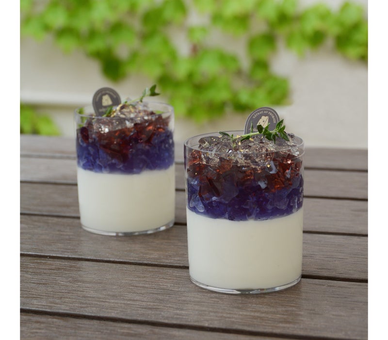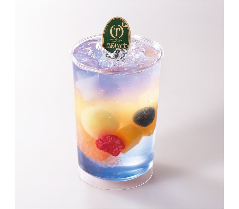 バタフライピージュレにシークァーサージュレを重ね、フルーツを浮かべたデザートです。