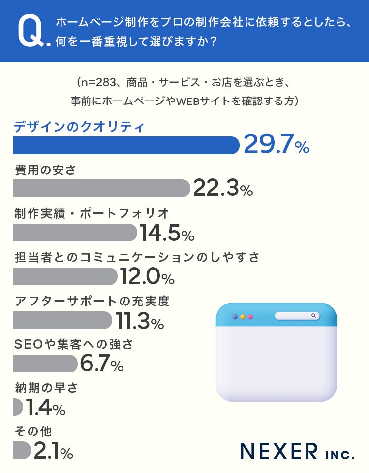 ■29.7%が、ホームページ制作会社を選ぶ際に「デザインのクオリティ」を最重視すると回答