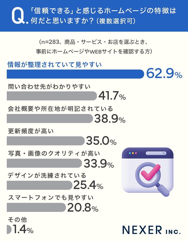 では、具体的にどのようなホームページが「信頼できる」と感じられるのでしょうか。