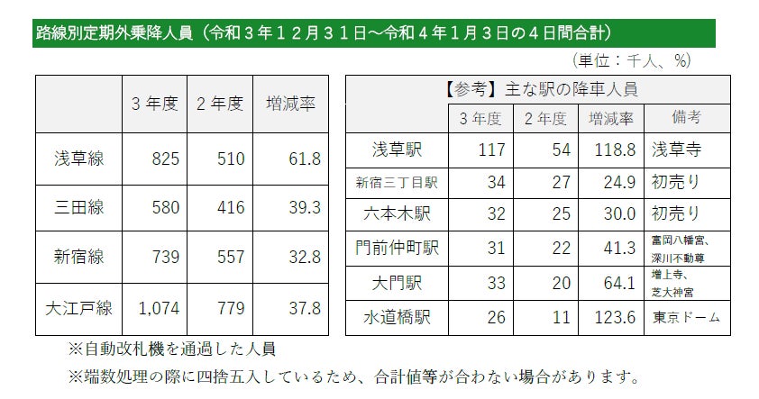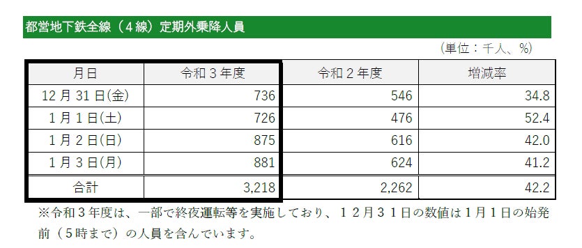 年末年始期間(令和3年12月31日~令和4年1月3日)における都営地下鉄の定期外利用状況について、お知らせします。