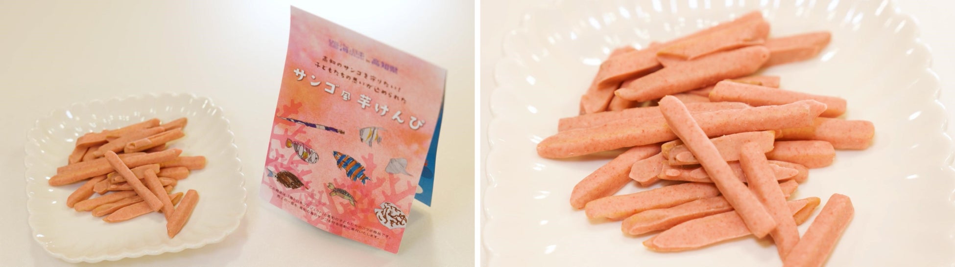 「美しい海を未来に繋ぐために自分たちにできること」その一つが、高知名物「芋けんぴ」を柏島の美しいサンゴに見立てた「サンゴ風芋けんぴ」の販売です。芋屋金次郎株式会社の協力を得て、「サンゴを守りたい」という思いを込め、子どもたちのサンゴのイラストが描かれたパッケージになっています。
