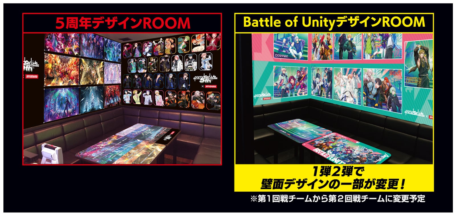 カラオケコラボルームのデザインには、「5周年デザイン」「Battle of Unityデザイン」の2パターンをご用意し、ルーム内の壁面やテーブル、ドアに至るまで、「Paradox Live」の世界観で彩り、ファンには堪らない空間となっております。