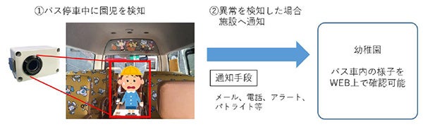 今般、通園バスで園児の置き去りを防止する見守りサービスの実用化に向けて、学校法人雲雀丘学園(住所:兵庫県宝塚市、雲雀丘学園幼稚園 園長:大冨亜紀)、古野電気株式会社(本社:兵庫県西宮市、社長:古野幸男)と共同でAIカメラを活用したバス車内の園児見守りの実証実験を開始します。