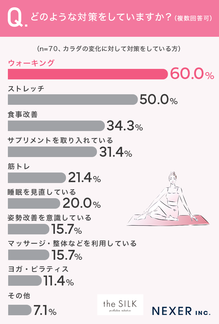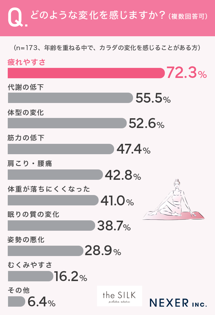 ということで今回はマシン専門ピラティススタジオ『the SILK(ザ シルク)』と共同で、全国の女性231名を対象に「年齢とカラダの変化」についてのアンケートをおこないました。