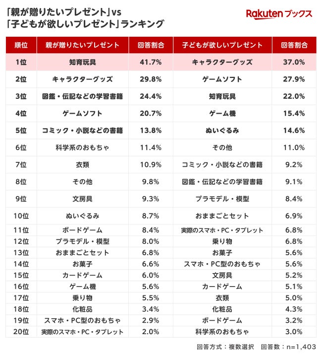 ■「親が贈りたいプレゼント」1位は「知育玩具」。一方で「子どもが欲しいプレゼント」1位は「キャラクターグッズ」。特に「ゲーム機」では、親子で順位に大きな違いも