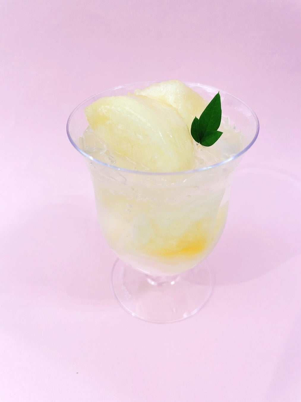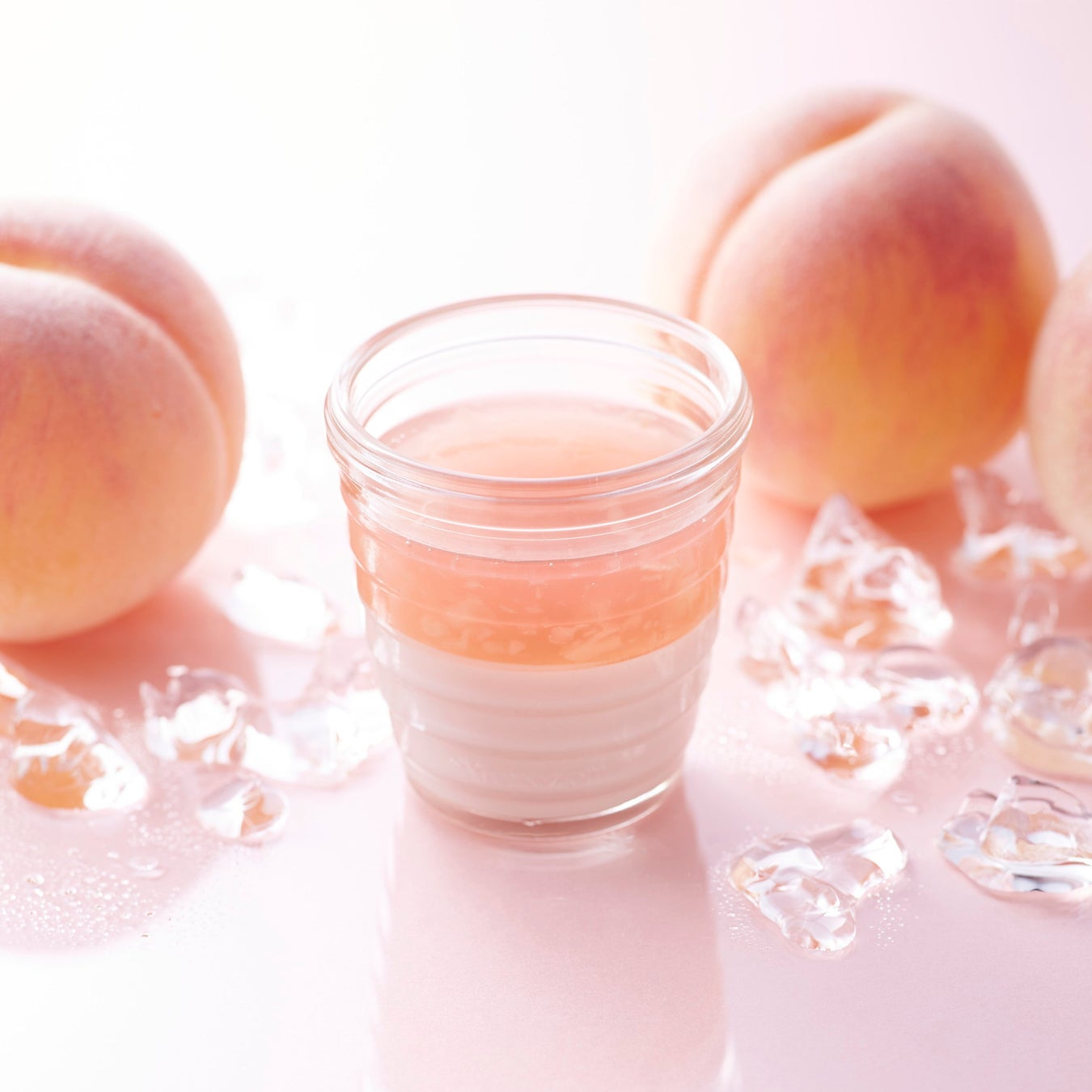 桃果汁の甘さとみずみずしさを感じられるとろける桃のプリンに、桃の果肉入りのとろっと食感のゼリーを重ねました。