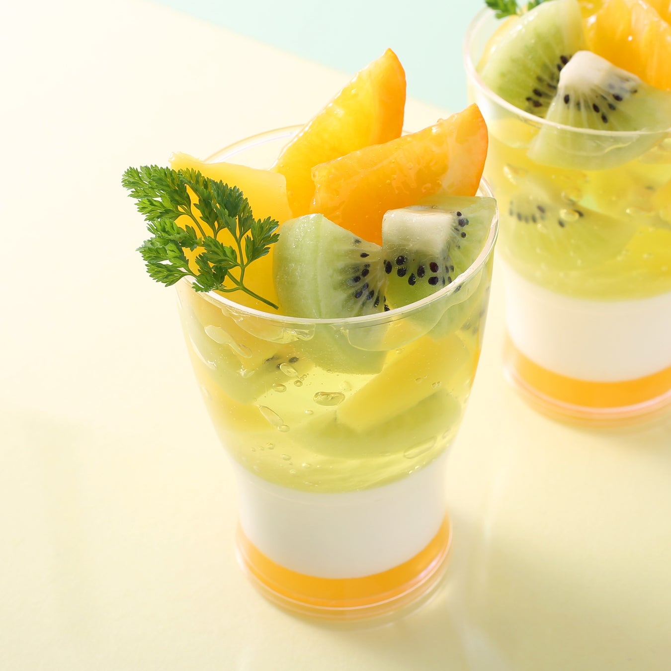 オレンジのコンフィチュールとライチのブランマンジェに、キウイとパイナップルが入ったライムのジュレを重ねました。