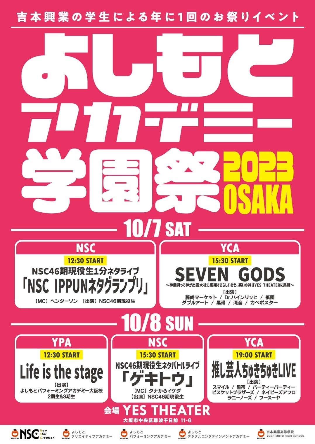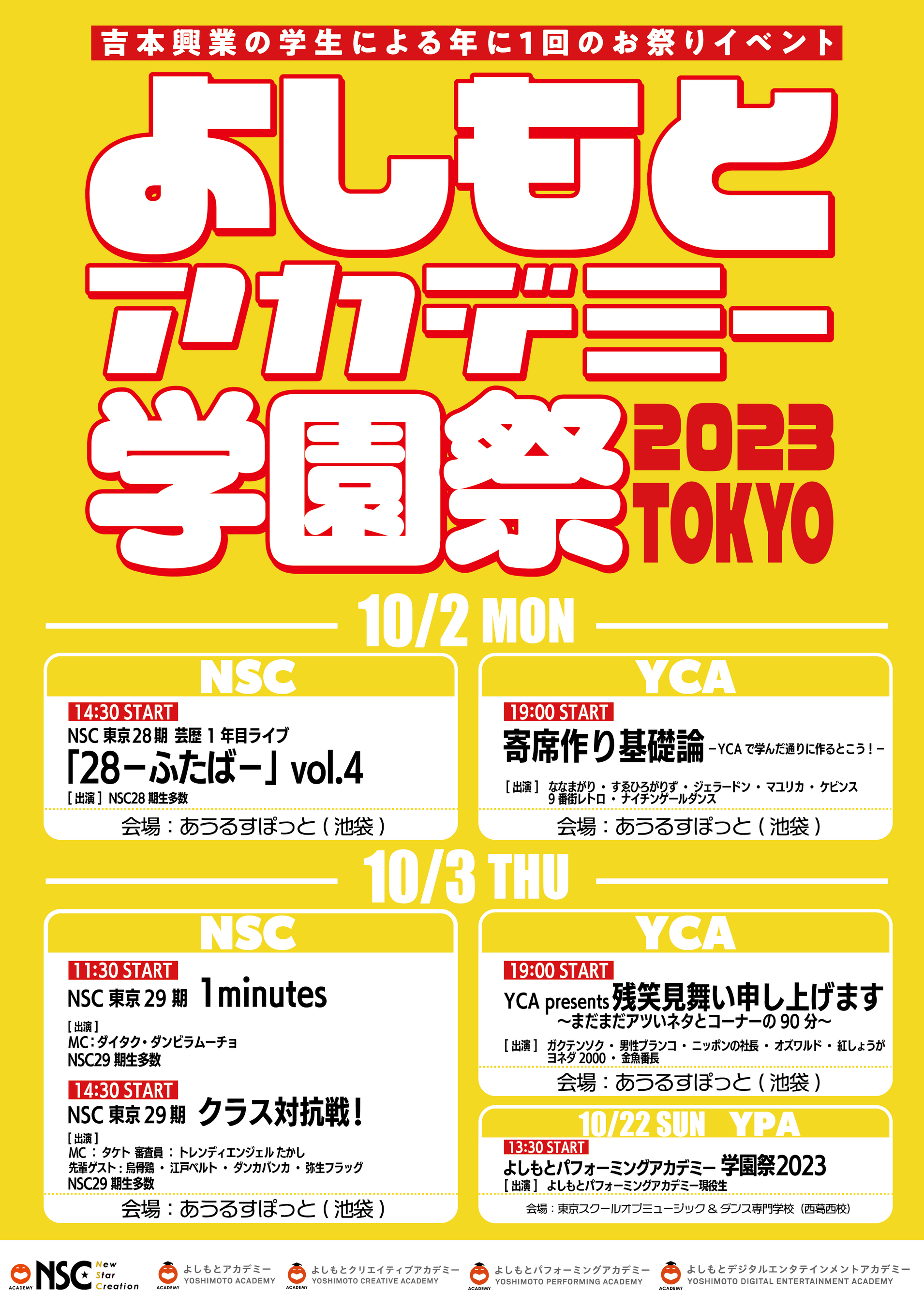 今年度もNSC、YCA、YPA、YDA、吉本興業高等学院、各校の生徒が「出演」または「企画・制作」する「学園祭」を東京校は10/2(月)月,3(火),22(土)、大阪校は10/7(土),8(日)に実施します!「NSC」は、現役生による1分ネタ、クラス対抗戦、さらに芸歴1年目の東京28期生による同期ライブを開催。「YCA(よしもとクリエイティブアカデミー)」は、人気芸人を招いての生徒企画のお笑いライブを実施。また学園祭全体の運営も担当します。「YPA(よしもとパフォーミングアカデミー)」は、歌・ダンス・演技を織り込んだステージを披露!そして「YDA(よしもとデジタルエンタテインメントアカデミー)」の生徒は、公演やPR動画を制作して、各公演で上映します。吉本興業の生徒たちの若きパワーが集結する、年に1回のお祭りイベント!アカデミー生の挑戦と発想、パフォーマンスを、ぜひお楽しみください!