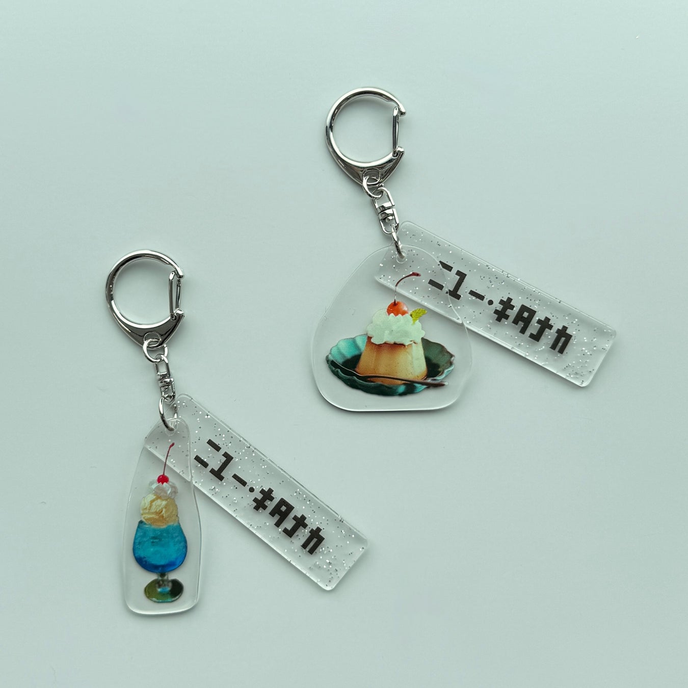 人気メニューのデザートとロゴプリントで組み合わせた可愛いキーホルダーです。プレート2枚使いでお手持ちのバッグにもアクセサリー感覚で付けていただけます。