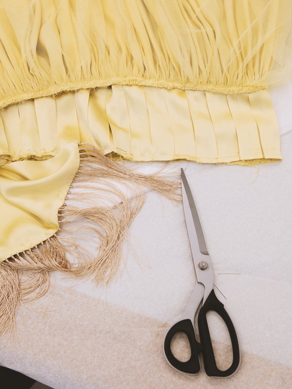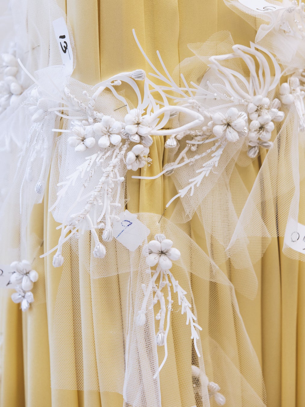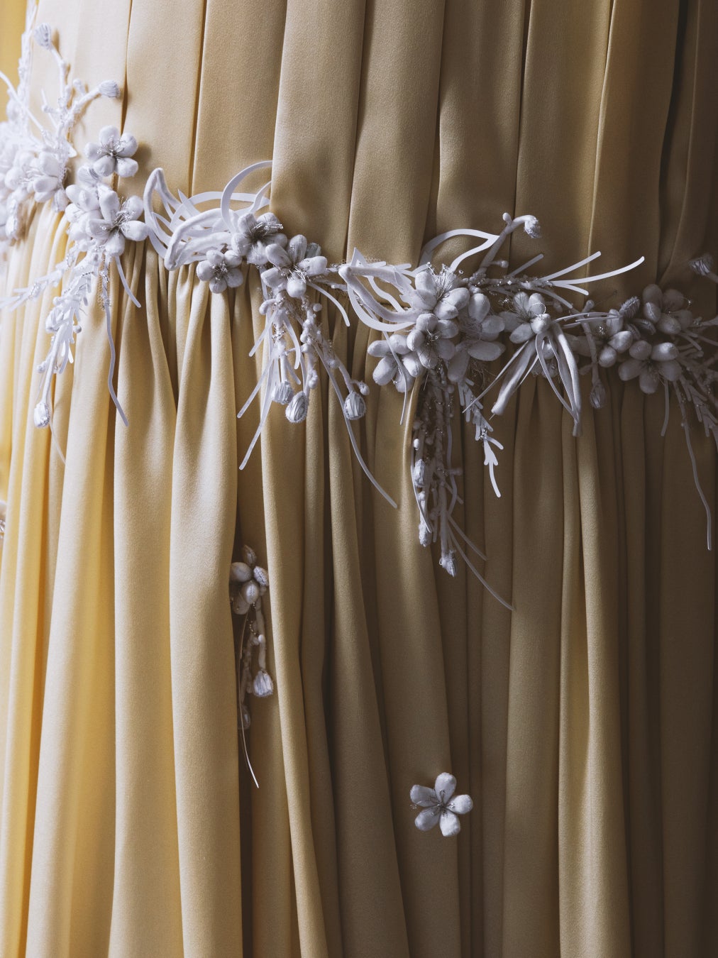 ロザムンド・パイクは刺繍をあしらったイエローのプリーツシルクドレスを纏いました。