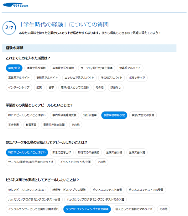 登録するスキルや経験は、「学業について」「学生時代の経験」「資格」「スキル」「希望勤務地域」「仕事に対する価値観」「志望志向」の7つのカテゴリーで構成されています。