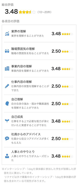 『インターンシップ&キャリア体験評価』機能も6月1日から公開します。就職準備に臨む学生から、インターンシップ&キャリアを探す際、他の学生や先輩が行った評価を参考にしたいという声が寄せられていました。この学生の声を受け、限られた時間の中で、学生が自分に合ったプログラムを探す新たな軸として本機能を搭載しております。学生からの投稿は6月1日から可能となり、各企業のインターンシップ&キャリアの評価は6月1日よりサイト上にて公開いたします。学生が評価を投稿できるのは、事前にエントリーし、プログラムを体験した『リクナビ2026』に掲載する全ての企業のインターンシップ&キャリアが対象です。学生は参加したプログラムについて、「総合評価」に加え、「業界の理解」「職場雰囲気の理解」「事業内容の理解」「仕事内容の理解」「自己理解」「自己成長」「社員からのアドバイス」「人事とのやりとり」の8項目、計9項目を5段階で評価します。項目ごとに入力された数値は独自ロジックで集計され、9項目それぞれにおいて、投稿した学生全体の評価として評価値が算出されます。