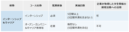 リクナビでは、経済産業省・文部科学省および厚生労働省の「インターンシップを始めとする学生のキャリア形成支援に係る取組の推進に当たっての基本的考え方」にのっとり、以下の表記で掲載しています。