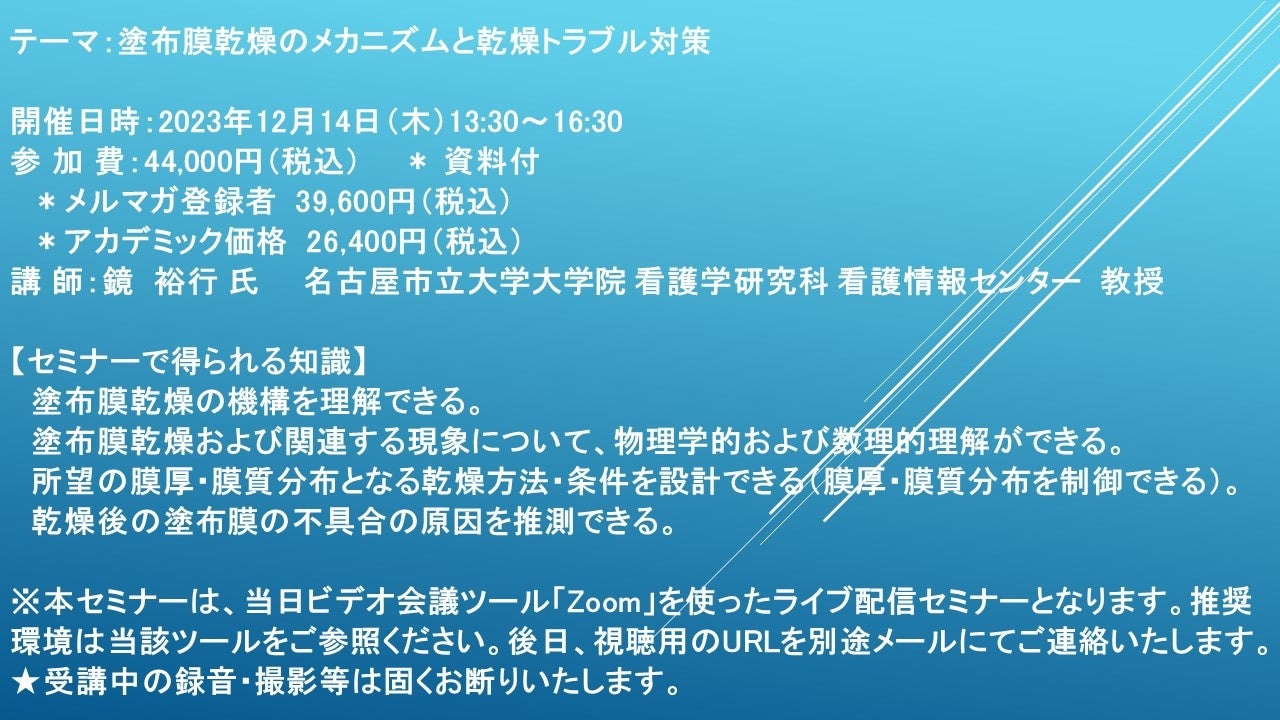 【ライブ配信セミナー】塗布膜乾燥のメカニズムと乾燥トラブル対策 12月14日(木)開催 主催:(株)シーエムシー・リサーチ