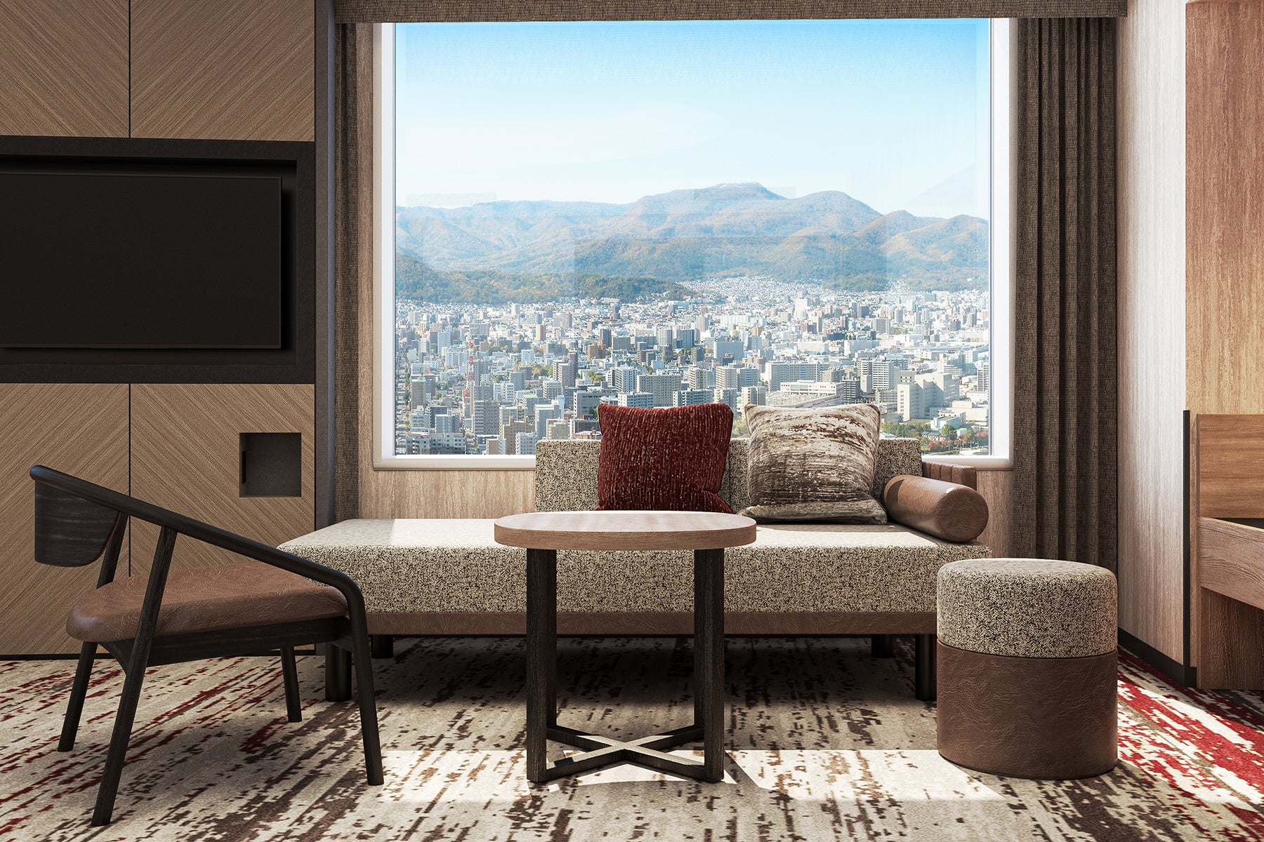今回のリニューアルでは、札幌の街並み、山並みを一望できる22~27階 81室の客室を、夕暮れ時の空をモチーフとしたデザインに改装。ダブルルームのベッドを窓に向けて配置する等、高層階の眺望を最大限に活かしながら、空間のゆとりに配慮した内装に一新いたします。