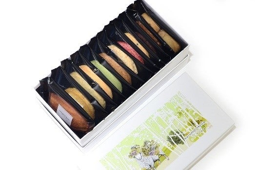 「クッキーシトロン」や「フィナンシェ ピスターシュ」など、〈kazunori ikeda individuel〉で人気の焼き菓子を中心に詰め合わせました。羊の描かれた爽やかなギフトボックスも印象的です。
