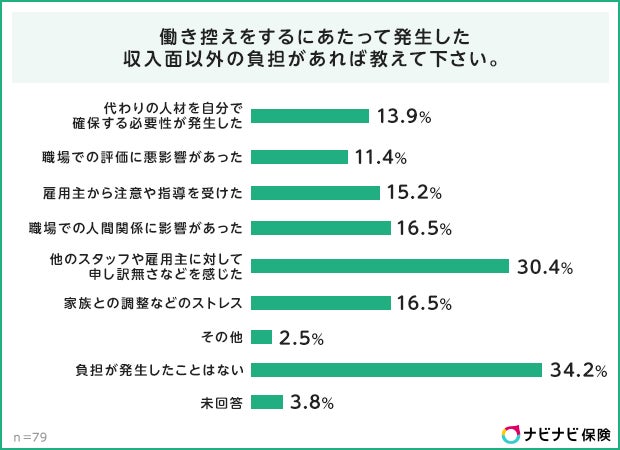 年収103万円の壁を意識していると回答した人に「働き控えを始める時期はいつですか?」と質問したところ、「働き控えの検討が必要になったことはない」(31.8%)という回答を除くと10月が17.1%と多い結果になりました。また、働き控えをするにあたって「負担が発生したことはない」(34.2%)と「未回答」(3.8%)を除くと約60%が収入面以外に負担を感じており、具体的には「他のスタッフや雇用主に対して申し訳無さなどを感じた」(30.4%)や「職場での人間関係に影響があった」(16.5%)と、心理的負担が発生していることが分かりました。
